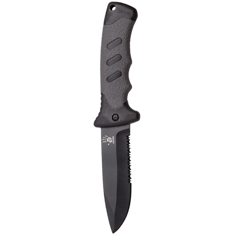 Hunting, hiking, camping, survival—in situations like these, never be without a sharp and sturdy knife, like the Fixed Half-Serrated Blade Drop Point Knife from 12 Survivors. This fixed-blade cutting tool features a partially-serrated blade made of black 3CR13 stainless steel and a soft-grip handle made of nylon and thermoplastic rubber for a secure and comfortable grip. A nylon sheath is included so you’ll always have your knife at the ready.