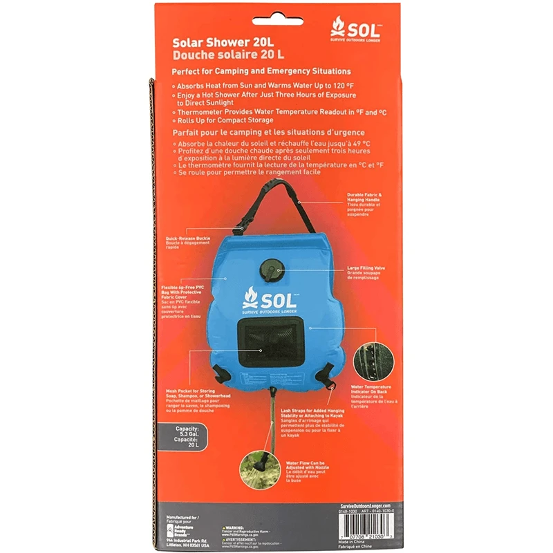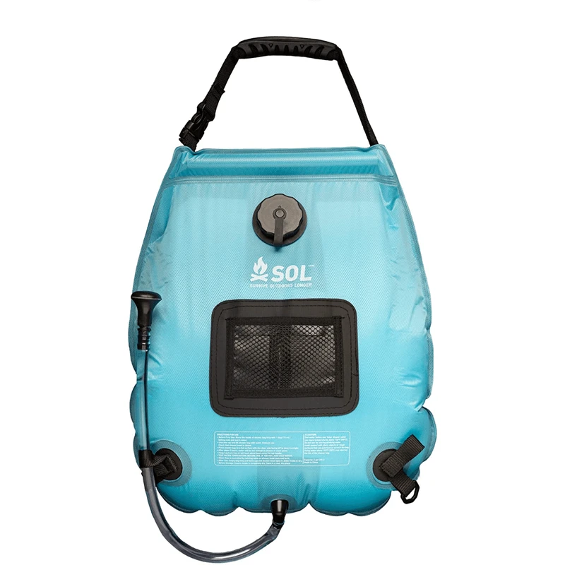 Rinse off after an adventure with the packable SOL Solar Shower’s 20 L capacity. This portable solar shower is easy to use with instructions and a thermometer printed on the bag. Simply unscrew the front cap for easy filling and place with the black backing material in the sun. It absorbs heat from the sun to warm the water up to 120° Fahrenheit. Hang above you with the rugged handle and buckle. Store toiletries and a mirror in the front mesh pocket for easy access during your shower. The flow-control shower head gives you the choice of water pressure. Make base camp feel like home with the SOL Solar Shower.