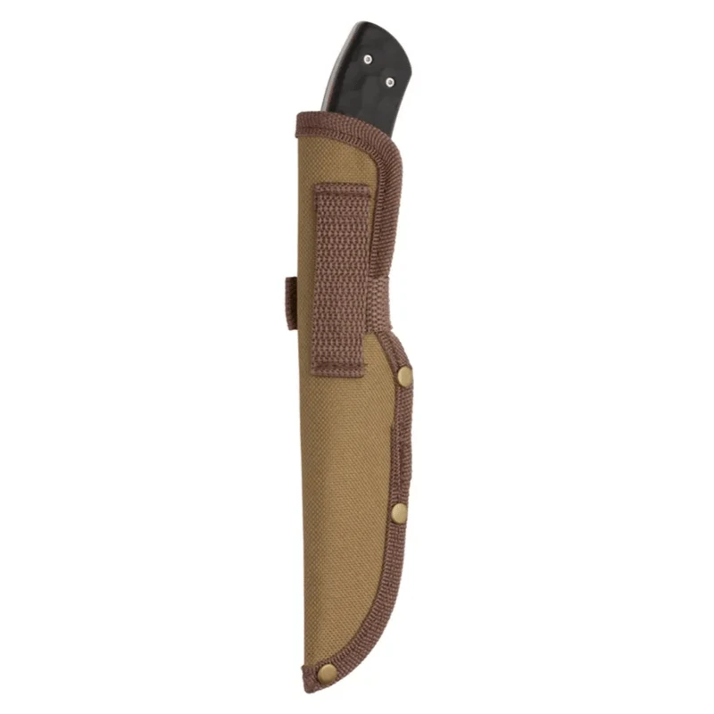 Large-sized skinner for big jobs. This is a fixed blade with full tang construction and anti-skid grooves on the blade spine. Rugged nylon belt sheath included. Â