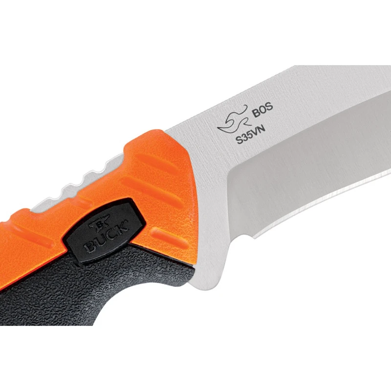 The 657 Pursuit Pro Large Guthook hunting knife combines a highly visible, sure grip handle with Buck’s high end S35VN steel. Buck’s S35VN steel provides the same edge retention as S30V steel but its properties allow it to resharpen easier, making it a great choice for skinning multiple animals with the option of field sharpening when necessary. The guthook makes quick work when field dressing. The 9 1/2″ (24.1 cm) full tang design and comfortable, contoured handle provide a durable knife that reduces hand fatigue while working. This knife is carried with a heavy-duty nylon sheath with a belt loop. Made in the USA and backed by Buck’s famous Forever Warranty, the fixed blade Pursuit knife covers all field needs from the beginner to serious hunter.