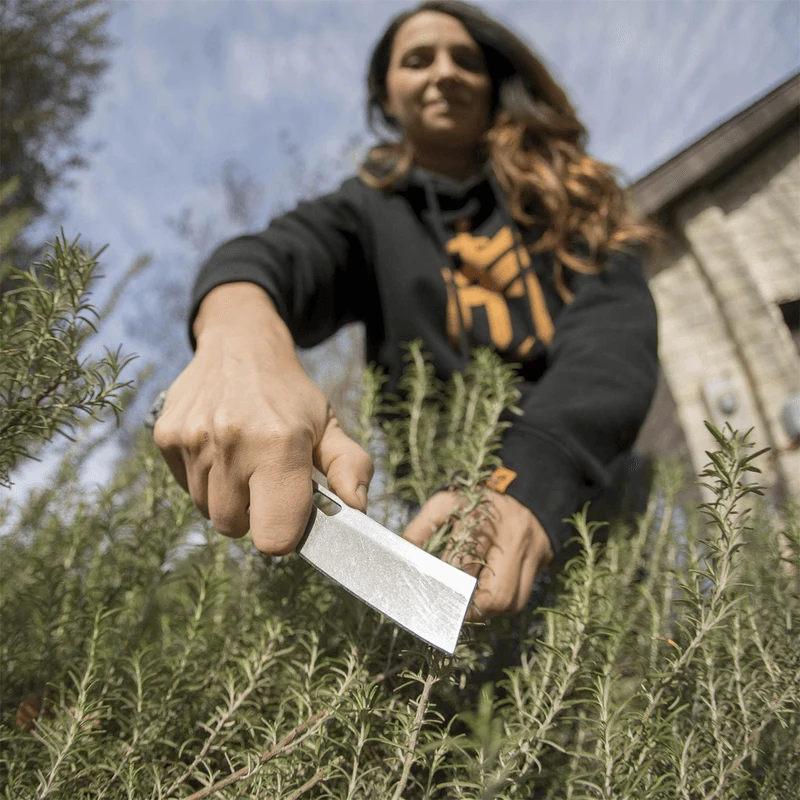 This pocket knife is built for utility with a cleaver blade in a folding application. The FlatIron pocket folder features a robust 3.6 inch blade, a textured micarta handle, and a sturdy frame lock design. The reverse curvature of the knife’s spine keeps knuckles away from the cutting surface, allowing the user to cut and chop with precision. Â