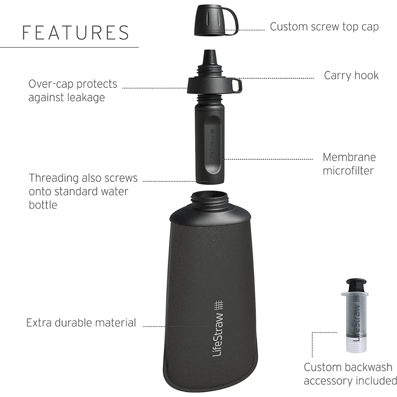 - Includes squeeze water bottle, microfilter, backwash plunger, and user manual