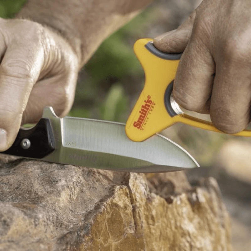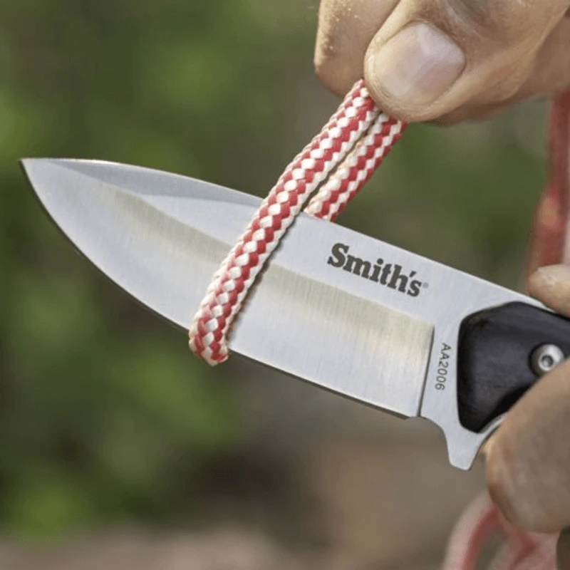 The EdgeSport 4″ fixed blade great for skinning and rugged use has a black Pakka wood handle with a lanyard hole and Cordura sheath. The combo includes Smith’s V-Sharp pull-over knife and game shear sharpener