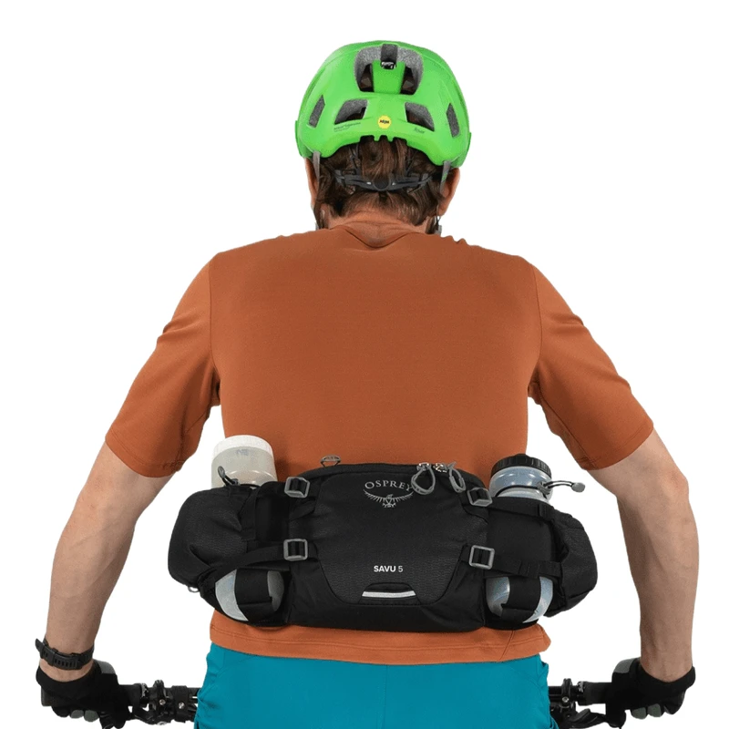 The perfect pack for the mountain biking minimalist, the Savu 5 lumbar pack is ideal for quick laps on local singletrack or gravel trails. Two rigid pockets make it easy to pull and replace water bottles as you pedal, while angled hipbelt and compression straps keep the pack close to your body and provide max stability over every trail. (No creep-around here.) Not a two water bottle kind of ride? No problem. Each water bottle sleeve can tuck away when not needed to provide a streamlined pack. Any way you customize it, the main compartment and side hipbelt pockets fit vital flat-fixing tools, a tube, snacks and more.
