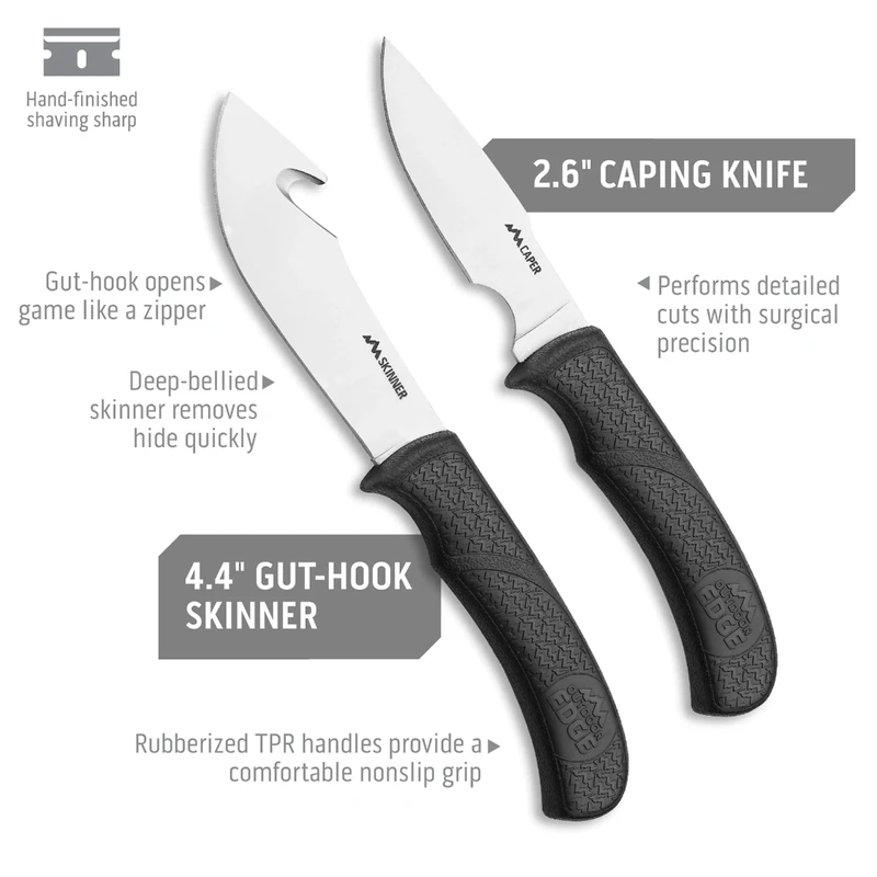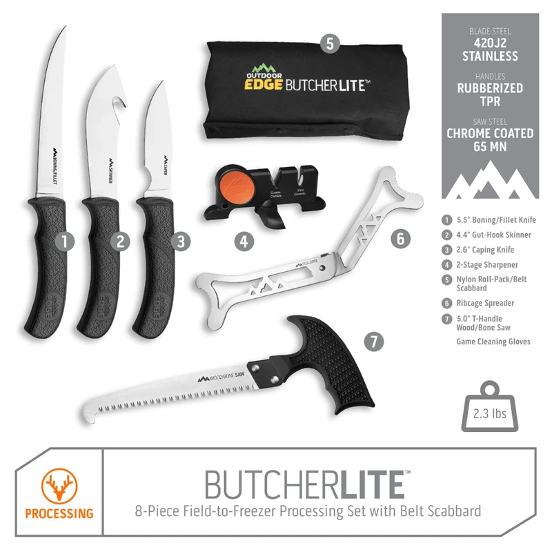 Complete 8-piece field-to-freezer game processing set with a nylon roll-pack that converts to a belt scabbard. This set includes a caping knife, gut-hook skinner, boning/fillet knife, wood/bone saw, ribcage spreader, game cleaning gloves, and a tungsten carbide sharpener to maintain a shaving-sharp edge at all times. The full-tang 420J2 stainless steel knife blades are precisely heat treated, taper ground thin and hand finished shaving-sharp for superior edge retention and performance. Rubberized TPR handles ensure comfort during long use and provide a safe, non-slip grip even when wet. Features snap-in, removable, knife scabbards for easy cleaning. Save the cost of commercial processing and guarantee the quality of the meat for your family with the Butcher-Lite.