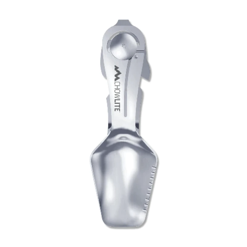 This lightweight stainless steel eating utensil gets the job done while taking up minimal space. The folding design swings open and locks securely, revealing a full size fork and spoon with a serrated food separator, integrated bottle opener, can opener and flathead screwdriver. Â