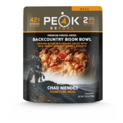 While creating this meal, they knew from the start that it had to have bison in it. Similar to the traditional Navajo taco dish, this meal consists of rice, beans, and bison meat in a delicious, creamy chili sauce. The best part? It also includes two whole buttermilk biscuits. This is a hearty, filling meal that not only has unbeatable taste and flavor, but will keep you full and content in the backcountry!Â