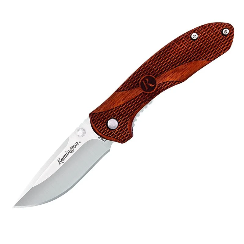 The Remington Heritage 6.5 Inch Folding Knife features easy one handed opening and a removable stainless steel clip with wooden textured handle. With a closed length of 3.8 inches this knife can clip snug to your pocket.
