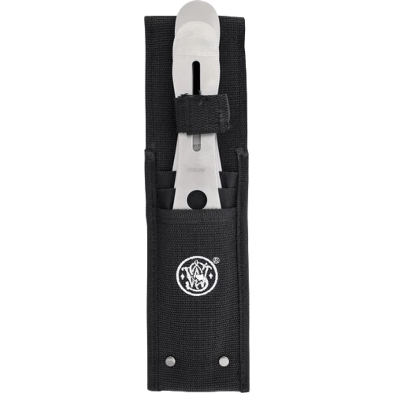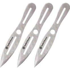 The Smith & Wesson 3 pack 10″ throwing knives have stainless-steel dual edged spear point blades. A polyester belt sheath is included. Â