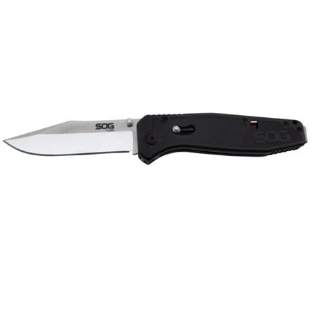 The SOG Flare assist features the patented SOG Assisted Technology (SAT) opening system. It also has a lightweight but strong glass-reinforced nylon (GRN) handle and a clip point blade that provides durability and versatility. The Flare is very slim and also includes the trademark reversible low-carry pocket clip, so you can carry it everywhere with confidence.