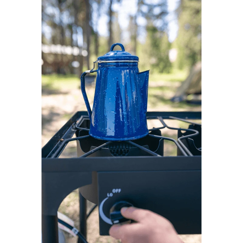 - Beautiful enamel percolator with sturdy pour handle and cool touch bail